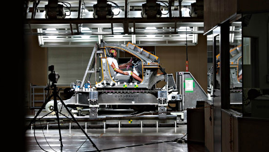 其三是虚拟碰撞实验装置。相比车身本身的安全,安全带和安全气囊的配合对于安全至关重要。东富士研究所的这个虚拟碰撞实验装置将假人安装在实验舱内,采用高精度的油压精密再现碰撞过程,通过模拟减速波的方式观察假人、安全带以及安全气囊在碰撞过程中的情况,从而为测试不同安全带和安全气囊对驾乘人员的保护情况。与一般的碰撞实验装置不同,这个装置的先进之处体现在其对碰撞的模拟精度上,此外它还能够模拟车辆碰撞后的前倾动作,从而为被动安全装置的研发提供实验数据的支持。