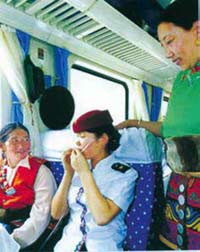青藏铁路处于海拔高度2 808~5 072米之间,大部分运行在海拔4 000米左右。缺氧,是对登上高原旅客的“第一威胁”。一般来说,海拔4 000米以上地段,旅客需要补充氧气。每节车厢的配置有两套供氧系统:一套是“弥散式”供氧,通过混合空调系统中的空气供氧,使每节车厢含氧量都保持在适当的水平,氧浓度达23.5%~25%,旅客如同进入“氧吧”。我们知道,氧气的分压在任何海拔高度均占大气压的21%,如果氧分压每增加1%,则约相当于降低海拔300米,如以平均氧增至24% 计,则约等于下降了900米。唐古拉山铁路运行高度为海拔4 000~4 500米,则通过弥散式供氧,等于在海拔3 000~3 500米高度运行,大大缓解了低氧程度,这在世界高山铁路上是独一无二的。另一套是独立的接口吸氧,如果有旅客需要更多的氧气,或发生高原反应时,只要您向乘务员提出,就可帮助您随时用吸氧管吸入氧气。每节车厢的制氧机和储氧瓶,都很巧妙地设在车厢底部的封闭箱里。另外列车的密封性能极好,保证了客车供氧的效果。