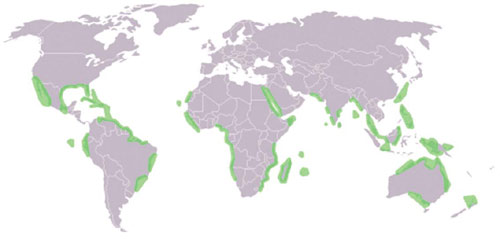 全球红树植物分布图(绿色区域为红树植物分布地带)