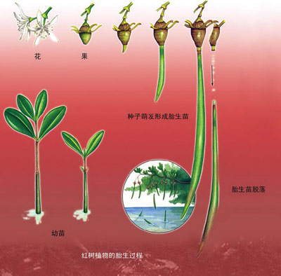胎生苗就是红树植物的胎儿,成熟后脱离母体植物,由于地心引力,再加上胎生苗下端的密度比上端大,胎生苗可以直直落下并插入到软泥中。这些幼苗会在母树附近生长,它们生根的能力很强,插入污泥数小时后下端就能长出侧根,幼苗进一步固定,并靠这些根吸收养料,上端则抽出茎叶。由于它们在母体植物就积累了大量的能量,并处于萌发前的状态,因此能在短短的几个小时就形成新的独立植株。如果这些胎生小苗在落下时运气差一点,没有插入泥中,或在涨潮时落入水中,由于它们比海水轻,且体内储存了大量的能量,因而也能随波逐流,历经数月不死。胎生苗体内含有单宁等化学成分,能防止水侵腐烂,也能避免海里的动物啃食,可以放心地旅行。它们一旦漂流到适宜生活的地区,遇到泥沙,能很快重新生根发芽。如果这时胎生苗是平躺在泥地上,它的下端也会生根,胚芽会向上弯曲生长,能很快使幼苗直立起来。成年的红树一年可以开花结果数次,在一年的不同时期,都有处于不同发育阶段的胎生幼苗。