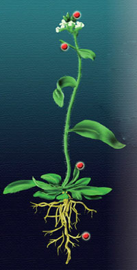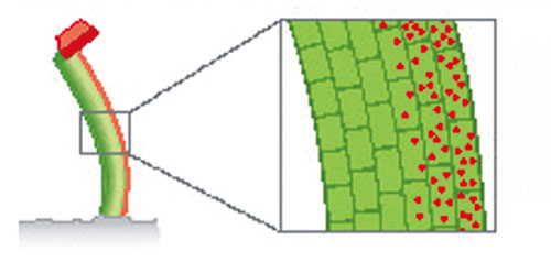 我们先来看一下乔罗尼和温特的生长素学说。生长素主要在幼嫩茎尖部位合成,随之被送到根尖特定的部位并富集起来。然后生长素侧向地被重新分配到其他区域并在那里调节细胞的伸长。但是当植物的根受到重力刺激(改变生长方向90°)时,生长素被优先运输到根的下侧伸长区,形成一个生长素分配上的浓度梯度,并在此部位起作用促使根尖向下弯曲。