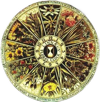 原来,经过长期观察和研究,林奈发现,在一天当中有些植物会在特定时间开花,可以藉此来预测时间。林奈把这一有趣的现象称为“花钟”,并首先提出这一概念。在上述书中,林奈描述了三组花。一组叫做Meteorici,花的开放与闭合随气候条件而变化;一组叫Tropici,花的开合随光照长短而变化;还有一组是Aequinoctales,花定时开放与闭合,不受天气影响。只有这第三组花适合制作成“花钟”。据说,利用花钟,林奈可以准确掌握时间,误差不出半小时。