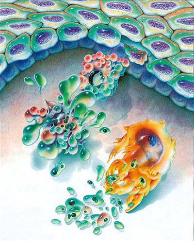 癌细胞几乎肆虐横行在人体的每一个部位,从大脑到各个器官,从表皮到骨骼,我们曾经引以为豪的人体在癌细胞面前显得那么不堪一击。值得注意的是,癌细胞并非入侵的外族,它们与组成人体的正常细胞遗传背景完全相同,可是它们基因结构和功能的变化赋予了它们6种武器,从而使得它们能够在体内纵横捭阖,所向披靡。