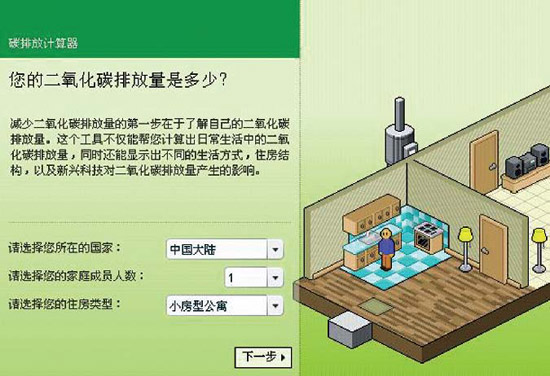 访问者要先回答包括家庭、家电和旅行三大类生活的一系列问题。如家内供暖设备、能源类型及费用;家用电灯数量、节能型灯泡的数量;短途出差和长途旅行的次数,使用交通工具情况;开车里程、车型以及燃料情况;电视、洗衣机等家用电器的待机状况和使用频率等。计算器将根据个人或家庭使用的耗能设备、家电和交通工具的情况计算二氧化碳的排放量,并为访问者提供节能降耗的建议。