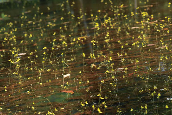 在我们面前的池塘里,黄花狸藻的种群非常兴旺,上百株狸藻无不在水面挺立着黄色花朵。微酸的水质,是狸藻繁茂生长的必要条件。不过,如今这有点本末倒置的味道:就进化角度而言,应当是酸性水中严重缺乏氮、磷等有机物,才至使狸藻进化出了食虫器官,补充营养;而在如今,脱离了微酸的水质,狸藻就不能茁壮生长,或者在与其他植物竞争的过程中落败。