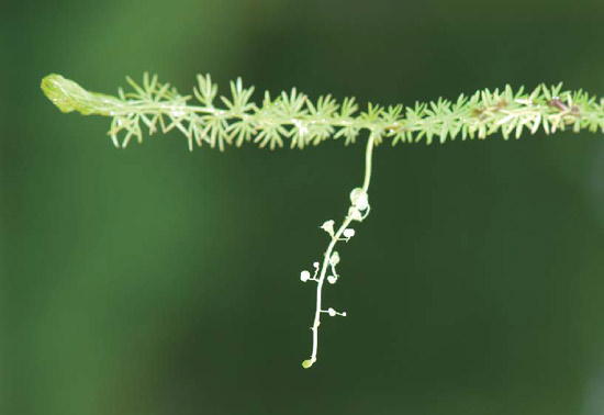 异枝狸藻。和黄花狸藻不同,异枝狸藻的茎上生有一个单独的捕虫枝,在这一捕虫枝上生有多个捕虫囊。