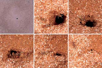行为生态学家托菲尔斯基和他的同事在研究这种巴西蚂蚁时发现,有些蚂蚁会留在洞外,它们用大大小小的沙子去遮盖入口,直至与外部无法辨别。第二天早晨,当洞口再次打开,留在外边的蚂蚁却早已无影无踪。即使研究人员将留在外面的蚂蚁放在塑料盒内,第二天也没有几个能存活。