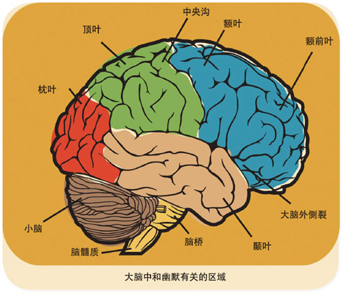 综合已有的研究来看,右侧前额叶,腹内侧前额叶,颞后区以及小脑是幽默加工的重要区域,和人的自我意识有关的能力,如记忆力、逻辑推理能力、语言抽象能力、感知能力和情绪,全都汇聚在这里。