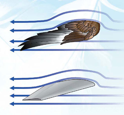 在长期的演化中,鸟的羽毛极适合于飞翔的需要。鸟类在扑动过程中不断改变自身羽毛的排列形式。同时,整个翅膀的形状和位置也在变化,往下扑动时,大羽毛彼此并紧使整个翅膀成为一张上下表面基本不通气的翼面。这样可以得到较大的上下表面压强差,上表面为负压,下表面为正压。而当翅膀向上抬起时,整个翅膀向内弯曲,大羽毛排列松开,上、下翼面之间出现了许多通气的缝,作用在翼面上的阻力就小多了。