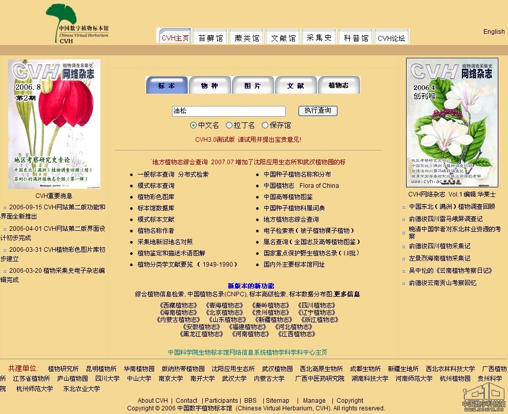 “中国数字植物标本馆(简称CVH)” 是一个跨部门的共建网站。成员单位除了中科院系统13家植物标本馆外,还有院外近20家,基本囊括了国内主要标本馆。目前上网信息主要是三百余万份数字标本,还有一批植物学数据库、各省区电子植物志以及植物野外生活照片等4个部分。新版CVH提供标本信息的GIS表达格式,并与站内外标本及物种信息关联,大大提高信息服务质量和效率。自2006年初开通以来,至2010年初,CVH的访问量达到一千七百万人(次)。CVH的建立,不仅为用户提供了一个方便快捷获取中国植物标本及相关植物学信息的电子网络平台,使得同行间交流与合作更加便捷,实现与国际接轨;政府及民间对植物多样性保护和可持续利用有了更便利获取参考资料的手段和渠道;对促进标本馆的现代化管理建设起到积极的作用。■
