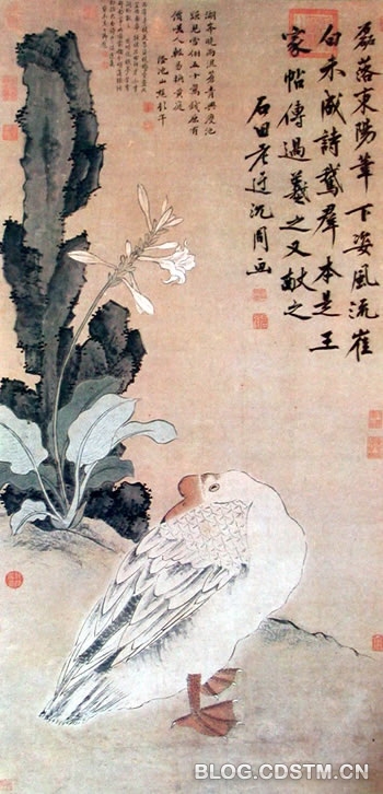 花卉是人类在大自然中,最常接触、采缬与审美的对象。明末才子金圣叹解悟道:“人看花,花看人;人看花,人销陨到花里边去;花看人,花销陨到人里边来。”而玉簪花,于初秋时节展露芳华,本小末大棒状的花朵,在花茎上斜举或者水平,未展时如一支晶莹温润的白玉簪,花开时清香扑鼻,其形其色其韵,均恰似一位来自天阙的仙女。因而,早在远古时代就被称之为瑶华,即神话传说中的仙花,引起诗人们美好的联想。正如宋·韩琦在《玉簪》诗中称颂的:“春早凡花百种荣,秋芳能得几多名?仙家八月灵葩发,不与寻常俗艳争。” 赞美玉簪花在秋季开花,不与百花争艳的高贵品质。唐代诗人罗隐写道:“雪魄冰姿俗不侵,阿谁移植小窗阴?若非月姊黄金钏,难买天孙白玉簪。”面对娇莹玉洁的玉簪花,诗人称它是天上仙女所遗的白玉簪,非有月亮姐姐的黄金手镯才能买得,足见其对玉簪花的喜爱。