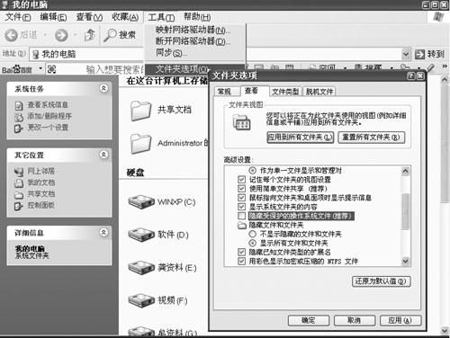 第一步:打开“我的电脑”,选取菜单[工具]→[文件夹选项]→[查看],在“查看”标签下,取消“高级设置”栏中的“隐藏受保护的操作系统文件(推荐)”复选框前面的对钩,再勾选“显示所有文件和文件夹”选项(如图1)。
