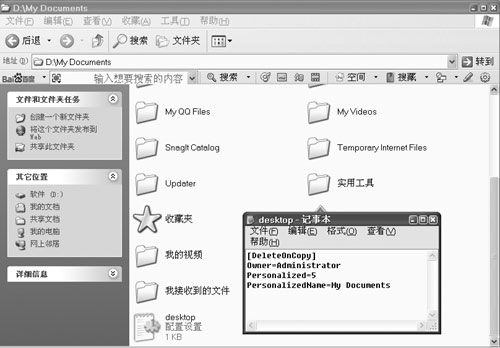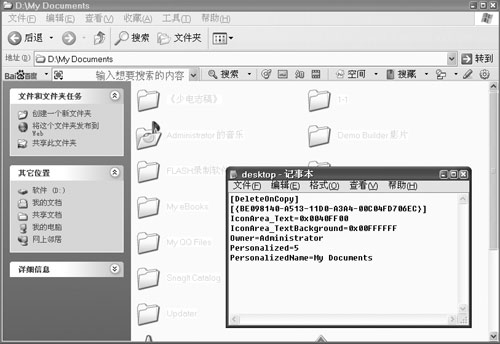 第二步:以“D:My Documents”系统文件夹为例,打开文件夹可看到“Desktop.ini”文件。用“记事本”打开“Desktop.ini”文件,可看到有关“D:My Documents”文件夹的相关信息(如图2)。