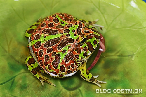 2014-04-29 10:32:31宠物“角蛙”其实叫做角花蟾,主要分布在南美洲。它们不是青蛙,属于薄趾蟾科,和难看的蟾蜍算是近亲。角花蟾从蝌蚪期就异常凶猛,体型差不多的幼蛙也会互相吞食,它们的大嘴几乎占了身体的一半。成体角花蟾能长到成年男性整个手掌那么大,超级肥胖的体型让它们行动很不方便,所以这些家伙最喜欢搞伏击,只要有猎物经过,它们就会伸出舌头把猎物拉入血盆大口。