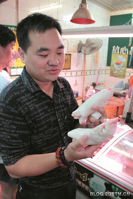 猪蹄要白净,毛褪得越干净越好,这样不仅减少了回家清理的麻烦,而且做糟卤猪蹄显得细嫩光滑。从这点来说,金锣冷鲜肉的猪蹄是武康菜场里品质较高的。