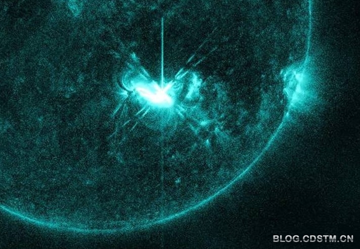 太阳表面的“烟花秀”在今年上演得尤为壮丽,今年7月太阳动力学天文台为我们捕捉到的这幅影像就是一个例子。图中闪耀的蓝绿色部分,是一个M5.3级的太阳耀斑,它在今年7月达到峰值。太阳动力学天文台选择131埃的波长对太阳进行监测,并捕获耀斑的信息,这是因为在这个波长上太阳耀斑辐射能够得到最佳的展示。
