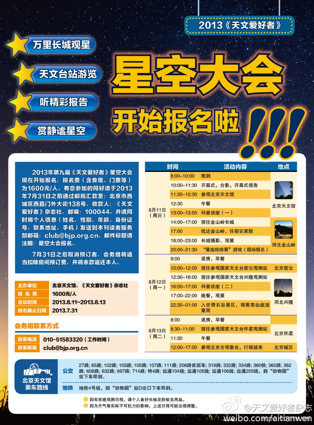 2013《天文爱好者》星空大会开始报名喽,人数限制在100人,大家莫失良机啊! 万里长城观星、天文台站游览,听精彩报告、赏静谧星空,全国天文爱好者的观星盛会,期待你的参与!