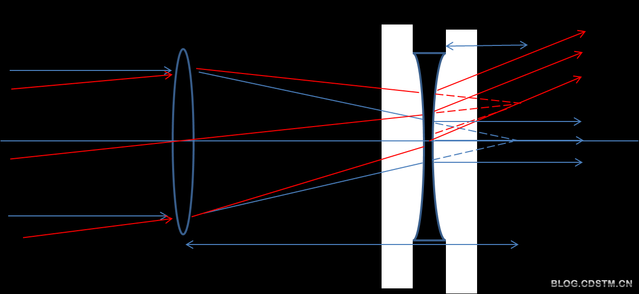 图2中画出了与计算放大倍数有关的几条重要光路。凹透镜右边的那条竖线代表凹透镜的焦平面。伽利略望远镜的特点是凹透镜的焦平面与凸透镜的焦平面是重合的,凹透镜位于凸透镜的焦平面以内。图2中,蓝色的光束平行于望远镜的对称轴(或称主光轴),它经过凸透镜以后,汇聚到凹透镜的右侧主光轴上的焦点上,这样的光线经过凹透镜扩散成了平行于主光轴的平行光。而另一束与主光轴成α夹角的光束,经过凸透镜以后,汇聚到凹透镜的右侧焦平面上的另外一点。这样的光线经过凹透镜扩散,变成了与主光轴成β角的平行光束(注意,通过薄透镜中心的光线是不会改变方向的,这是薄透镜的重要性之一,也是计算放大倍数的关键)。很容易得知,tanβ/tanα=(h/f2)/(h/f1)=f1/f2。而在一般望远镜的使用中,α和β都是很小的角度,所以tanα约等于α,tanβ约等于β,望远镜的放大倍数可以很容易得到为β/α=f1/f2。这是一个很容易记住也很重要的结论,即望远镜的放大倍数等于物镜和目镜的焦距之比。