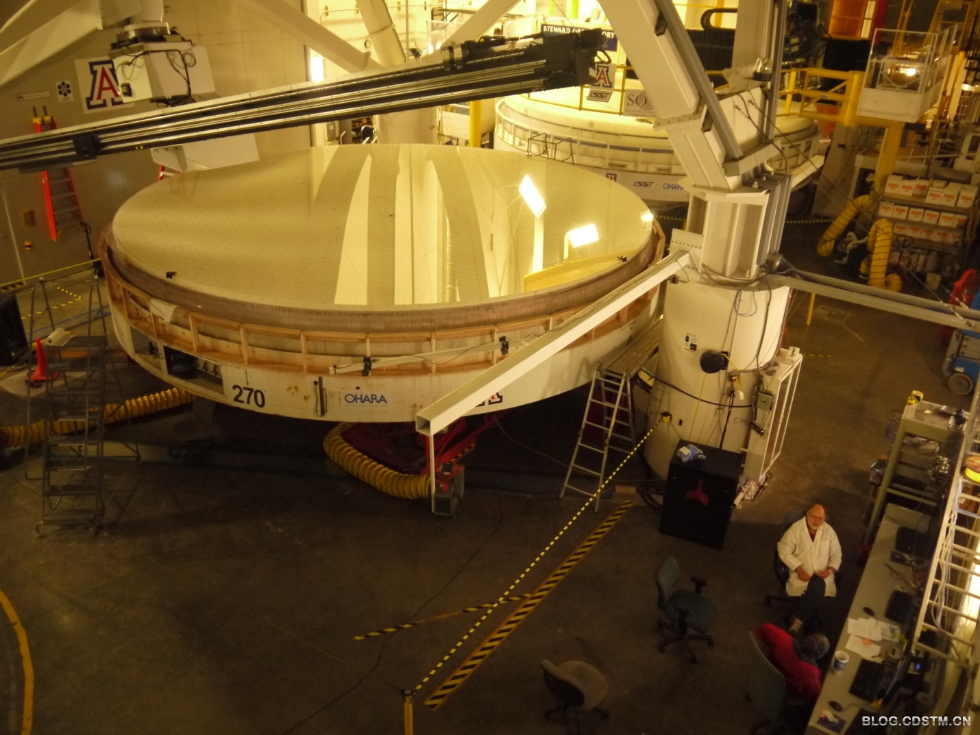Lab),了解了整个镜子制造的流程。图8中就是一块已经铸造成型、正在打磨的大麦哲伦望远镜的一块反射镜。对比图右下方的研究人员,我们就可以感受到这块玻璃的巨大了。它的表面已经过数次打磨,光滑可鉴。整个打磨的过程要一年多。
