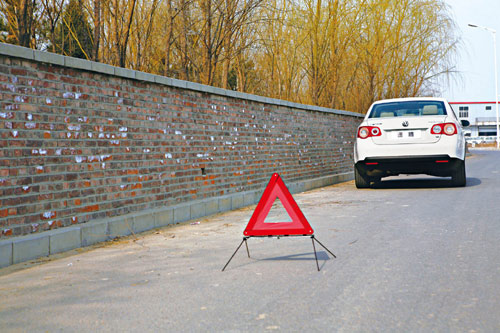 2.第二步:按下车辆危险报警提示灯(双闪灯),待车辆停好后,拉起手制动拉杆(手刹)。当您确认安全后,下车走到车尾处,从行李厢中取出三角警示牌,在车尾部左后方50 m左右的地方摆好,以便提前提醒后边的车辆,该车出现了故障。