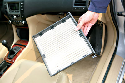 3.一般说来,空调滤芯的更换周期为1万~2万km,如果经常对空调滤芯进行清理会一定程度上延长空调滤芯的使用寿命,但车辆行驶2万km以上,应及时更换空调滤芯。因为此时空调滤芯内的活性炭过滤功能已经减退,过滤效果开始下降。