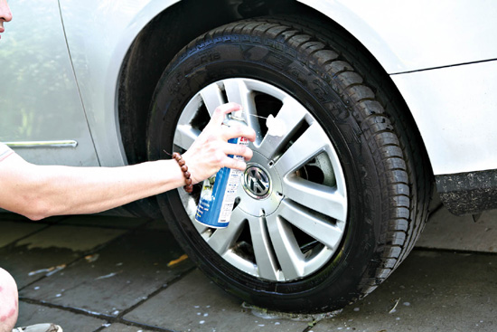 第七步:最后,用干净的毛巾或麂皮将车身擦拭干净。这时,别忘了为车辆的轮胎做一下美容。可以选用轮胎增亮保护剂或轮胎泡沫清洗剂来清理轮胎胎面。也可以选用轮辋清洗剂为车轮的轮辋进行清理。