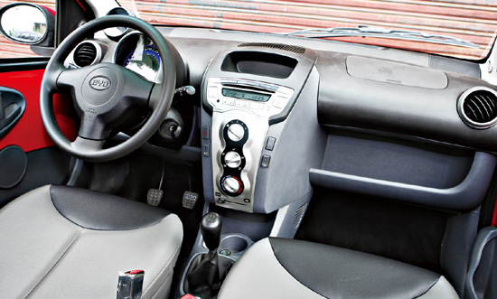 毫无疑问,F0可爱的外表会打动一批数量可观的受众,这一点从几天来的试车中就可看出——已经不止一次有路边的观者取出手机为F0拍照。那么“小精灵”的车内又是何景象呢?车内大量的圆形与弧线设计很好地延续了可爱路线,其中最为突出的设计莫过于独立的圆形仪表盘了,速度表位于方向盘的正前方,而转速表则“斜插”在旁边,感觉非常卡通,甚至有些像不同寻常的“米奇”呢!比亚迪F0的方向盘具有上下调节功能,在移动时,与它一体的两个仪表盘也会跟随着发生位置变化,这种设计不仅可以提升视觉效果,让它充满个性,同时,在方向盘发生移动后,仪表盘的读取角度也不会受到阻挡,保证了行驶安全性。竖向排列的三个圆形控制钮与雅力士有些类似,尽管这样的设计占据了很大的空间,影响了中控台储物空间的设计,但使用起来却颇为便捷。