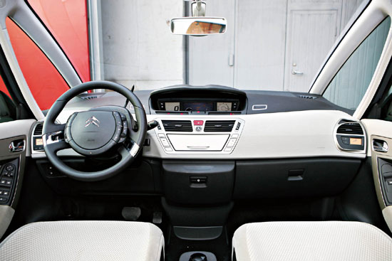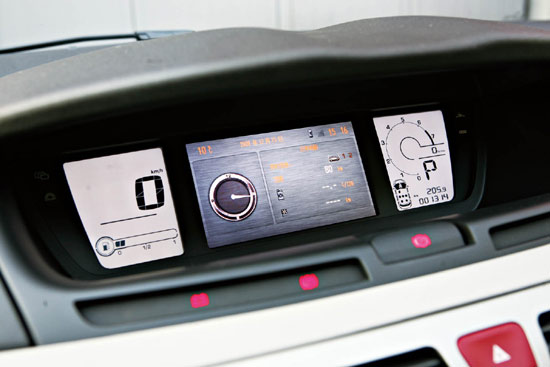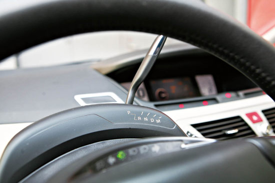 大C4毕加索的挡把设计比较特殊,被放置在方向盘后面有点类似“怀挡”的形式,方向盘上还设置了换挡拨片,当然对于宽体的MPV车型,其存在意义显然大于实用性。经过重新调校的4挡自动变速器尽管已经在尽力将动力平顺输出,但受到挡位数的限制,在行进过程中的换挡冲击仍然发生几率较高。此外,为了提升前排座椅中央的空间,新式自动电子驻车制动装置的控制按钮被安置于仪表台上,个人感觉使用不甚方便。