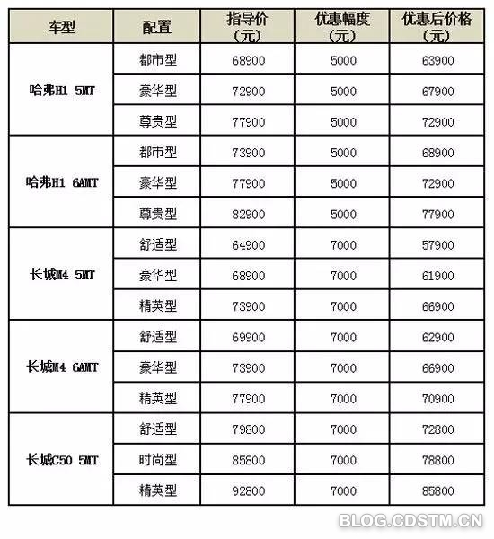 自2015年6月29日起至2015年9月30日,消费者购买哈弗H1任意一款车型均可享受5000元现金优惠,购买长城M4、长城C50任意一款车型均可享受7000元现金优惠。