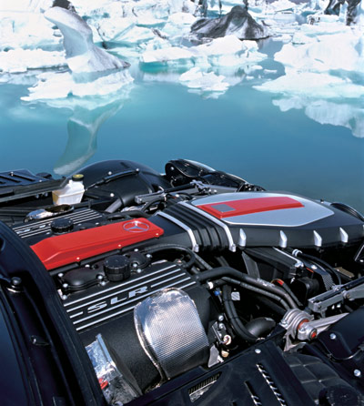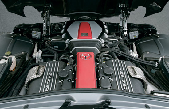 SLR有着经典的外形设计,然而在这里我们要说的重点当然不是它的外形,它修长的发动机舱也并不单单为了美观才采用这样的设计,更重要的是发动机纵置布局和机械增压器给发动机带来了更长尺寸。SLR采用的是机械增压5.5LV8发动机,虽然在奔驰的历史上也曾有使用涡轮增压的的例子,但是就目前来看奔驰更喜欢用机械增压来为发动机提升动力。这台5.5LV8发动机由于采用了机械增压,所以就不会有涡轮增压所具有的迟滞现象,而又由于它的排量已经属于超大号,所以对于机械增压器所消耗的那些动力已经不足以再做计算。大排量加机械增压器,这台发动机可以输出460kW的最大功率和780N·m的最大扭矩,这一点是保时捷997Turbo所不能够比拟的。