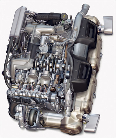 作为新款911,保时捷还是对它的动力单元进行了有效升级,这台双涡轮增压3.6L水平对置6缸发动机最大功率由原来的309kW增至353kW,最大扭矩也更是由原来的560N·m升至620N·m。997Turbo是沿用996Turbo的3.6L水平对置6缸发动机,能够有如此大幅度的性能提升,并非仅仅是工程师调校的结果,更重要的是保时捷VTG可变几何涡轮增压器的引入。这是一项通过改变涡轮叶片旋向来实现兼具大小涡轮增压器特点的技术,使用了VTG涡轮增压器的保时捷3.6L水平对置6缸发动机在动力输出和涡轮增压器响应上都有了很大的提升。有关保时捷VTG涡轮增压器的介绍,有兴趣的读者可以翻看我们《车主之友》2008年7月刊160页的《优势互补》一文,这里就不做太多介绍。