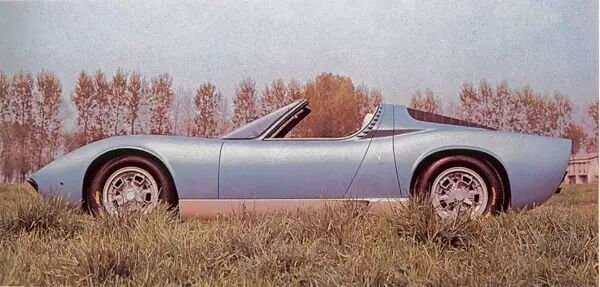 设计大师Nuccio Bertone与Marcello Gandini联袂打造Miura Roadster的流线型车身。首次采用横向中置发动机设计。更大尺寸的进气口优化了进气效率,确保所搭载的4.0L V12发动机能够释放257kW的最大输出功率。这款车还配有低位防倾杆、重塑的后车身线条以及无顶篷与无边窗的独特设计。