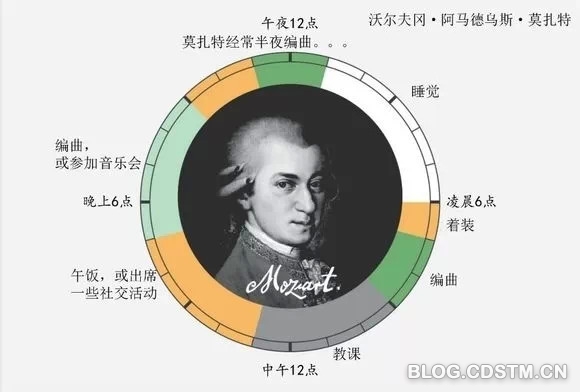 莫扎特,每天熬到凌晨1点,只睡5个小时。除了作曲以外,花很多的时间在打扮、社交和追姑娘上。