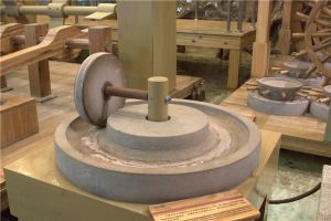 石碾,是用白石做的,是用来碾米、碾面的工具。石碾由一圆形平面的碾盘和一圆柱滚形的碾磙构成,碾盘中间有一个洞,里面插着一根木柱,是整个石碾的中心轴。碾磙前面的木框上插一根长长的木棍,用来推碾。石碾多以人推或畜拉。碾盘和碾滚上皆凿刻有规则的凹槽,目的是增加碾压的摩擦力,从而使粮食磨的更为细碎。科技馆的石碾是用水为动力,用这种方法加工可以达到省时省力,提高工作效率等特点。