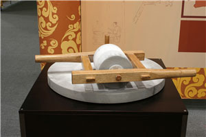 此件展品是科技馆新馆展品,它是石制的一种研磨滚压工具,供加工谷物,就是通过碾压谷物,使谷物从壳中分离的器具。如:将谷子加工成小米就要使用此工具。