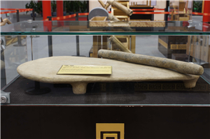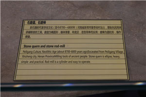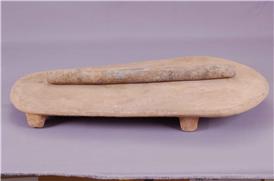 原始先民用来研碾粮食的工具。磨盘为椭圆形,器体厚重,有底足,造型简单而实用;磨棒为圆柱形,操作便捷。