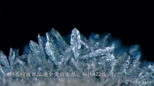 活泼金属可以和较不活泼金属盐溶液发生置换反应。锌比银、铅、铜和锡活泼,因此在硝酸银、硝酸铅、硫酸铜和氯化锡溶液中加入一小块锌片时,锌片表面会生长出其他金属的微晶。此外,铜也可以置换出硝酸银中的银。该影片使用微距摄影和显微摄影拍摄。(摄影:朱文婷)