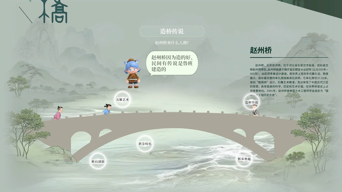 赵州桥,又称安济桥,位于河北省石家庄市赵县,因赵县古称赵州而得名。赵州桥始建于隋开皇后期至大业初年(公元595年一605年),由匠师李春设计建造,是世界上现存年代最久远,跨度最大,保存最完整的单孔圆弧敞肩石拱桥。它单孔跨径37.02米,首创"敞肩拱"设计,石雕艺术精湛,充分体现了中国古代工匠的智慧,具有极高的科学,历史和艺术价值,在世界桥梁史上占用重要地位。1991年,赵州桥被美国土木工程师学会选定为"国际土木工程历史古迹"。