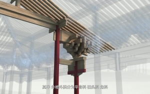 斗栱是中国古代建筑上特有的、集榫卯技术大成的特殊构件。它由斗、升、栱、翘、昂等部件组成,是较大建筑物的柱与屋顶间之过渡部份。其功用在于将屋架荷载传递到柱子上,再由柱子传到基础。斗栱纵横叠交,形成一层斗栱群,可以起到抗震的作用。此外,斗栱向外出挑,使得建筑物更加深远,造型更加优美壮观。它构造精巧,造型美观,也是很好的装饰性构件。