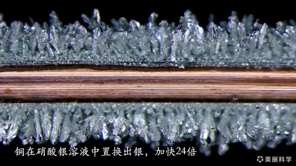 活泼金属可以和较不活泼金属盐溶液发生置换反应。铜比银活泼,锌比铅活泼,因此铜和锌分别可以置换出硝酸银和硝酸铅溶液中的银和铅,生成银和铅的微晶。该影片比较了银和铅微晶不同的生长模式,所有的镜头都是使用显微摄影拍摄。(摄影:梁琰)