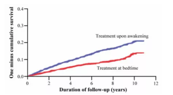 研究人员们招募了19084名正常作息的成年血压患者,他们平均年龄60.5岁,10614人为男性。参与者们被随机分配在晚上睡觉前或早上起床后根据医生建议服用降压药,并接受至少每年一次的随访,化验血尿,测量48小时动态血压。