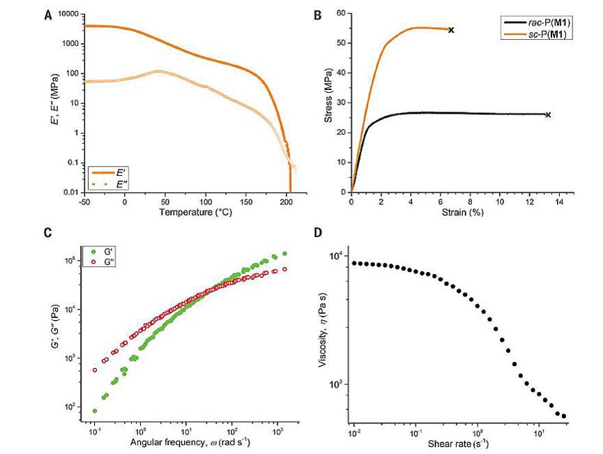 将单体M1的不同对映体分别聚合,可得到具有不同手性的聚合物。将它们1:1进行共混,可以得到具有高结晶性的立构复合材料。这种结晶性聚合物的主要热性质和力学性能与典型的结晶性聚(L-乳酸)材料相当,比如熔点186 ℃、极限抗拉强度54.7±4 MPa、杨氏模量2.72±0.25 GPa、断裂生长率6.5±1.2%。