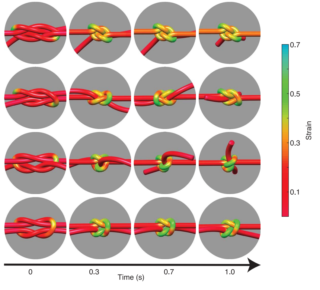 根据压力传感纤维绘制出的颜色图,合并到他们的意大利面模型中,然后使用该模型模拟研究人员使用纤维物理绑扎的相同结。当他们将实验中的打结与模拟中的打结进行比较时,他们发现两者的颜色模式实际上是相同的。这说明,该数学模型可以准确模拟打结中的应力分布。