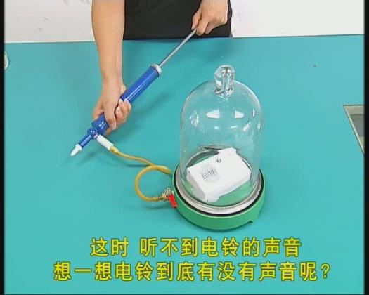 将电铃放入密封瓶中通过活塞向外抽气体,电铃在密封瓶中传出来的声音时大时小,从而可以证明了声音是在空气中传播的。声音无法在真空中传播。
