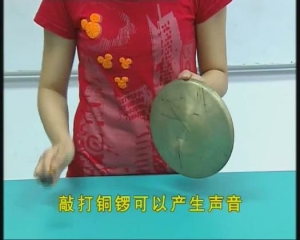 通过敲打铜锣产生声音,说明了物体振动是产生声音的根源。敲打铜锣后再用手按住锣面,此时声音停止,充分说明了声音的产生是由于物体振动而产生,物体振动停止,声音也会停止。