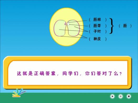 用生动的动画展示了蚕豆的组成部分。蚕豆是由胚根、胚芽、子叶和种皮组成,这几部分组成了蚕豆的主要部分胚。