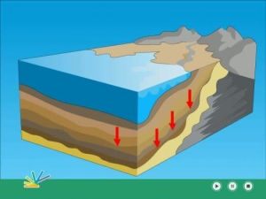 用生动的动画展示了沉积岩的形成过程。由于堆积层不断增厚,下面的部分由于压力和温度的原因逐渐形成了坚硬的沉积岩。