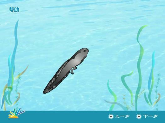 以生动的动画演绎了青蛙是由受精卵变成小蝌蚪,慢慢小蝌蚪长出两条后腿,逐渐变化,身体由黑色渐渐变成深灰色,并且也长出前腿,最后身体逐渐变成绿色,并且尾巴变小直到没有,变成青蛙。