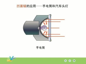 以生动的方式介绍了把小灯泡放在凹面镜的焦点上,灯泡发出的光经凹面镜的反射后变成平行光射出。手电筒就是采用了这样的原理,使光束集中、亮度大、照射的距离远。