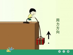 以生动活泼的动画形式,让我们了解了没用使用定滑轮前向上拉动物体,用力方向是向上的,使用定滑轮后拉动物体向上,用力方向向下。说明了定滑轮可以改变力的方向。